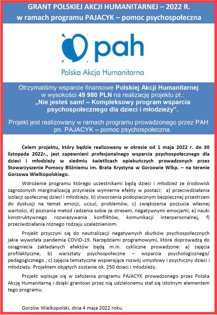 Grant Polskiej Akcji Humanitarnej w ramach programu PAJACYK – pomoc psychospołeczna.