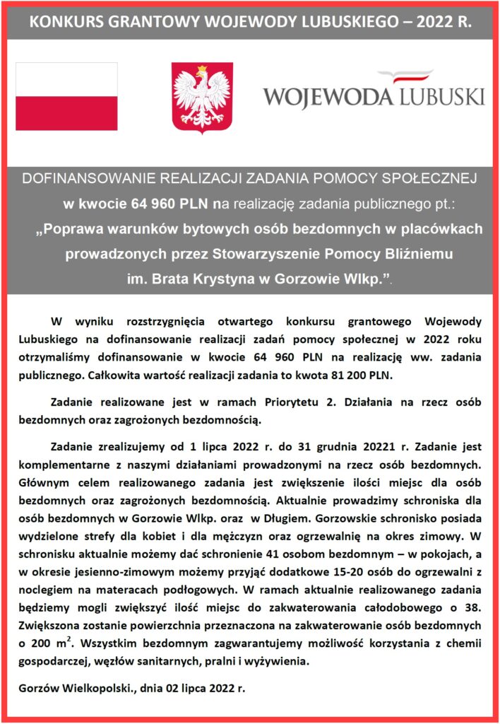 W wyniku rozstrzygnięcia otwartego konkursu grantowego Wojewody Lubuskiego na dofinansowanie realizacji zadań pomocy społecznej w 2021 roku, otrzymaliśmy dofinansowanie w kwocie 33 700 PLN, na realizację ww. zadania publicznego. Całkowita wartość realizacji zadania to kwota 42 125 PLN.